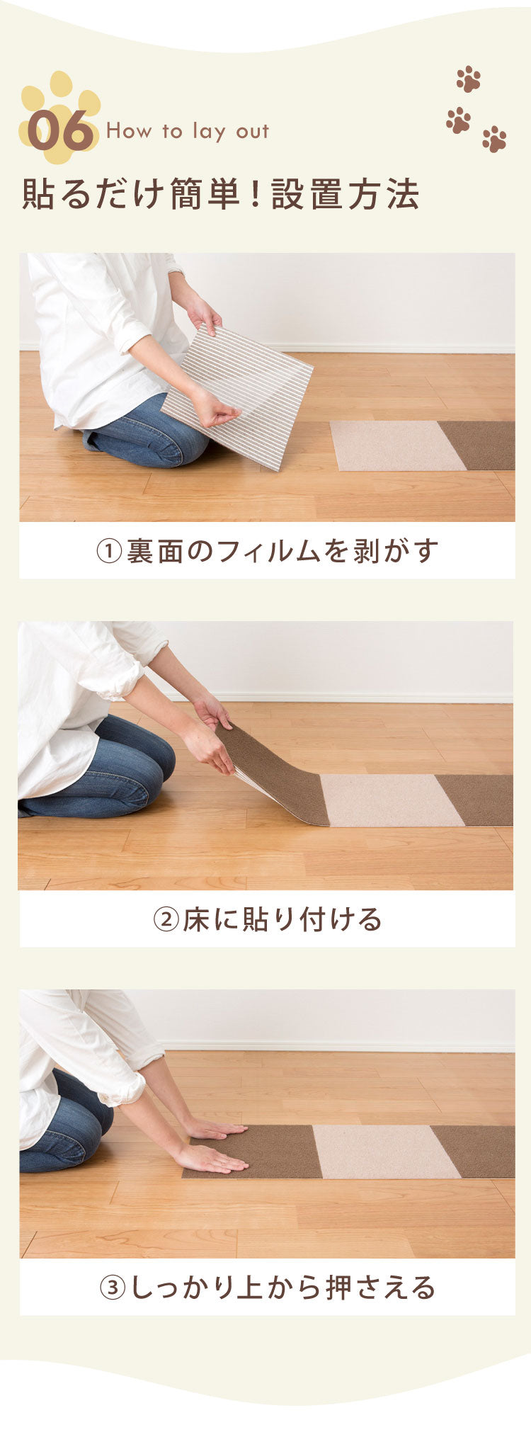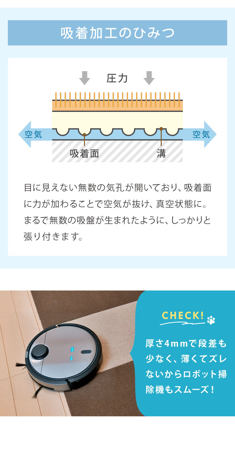 ・掃除機をかけても、裏面の吸着効果でめくれ上がることがないので、お掃除もラクラク!