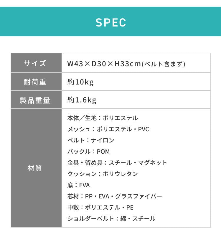本体/生地:ポリエステル、メッシュ:ポリエステル・PVC、ベルト:ナイロン、バックル:POM、金具:スチール、留め具:スチール・マグネット、クッション:ポリウレタン、底:EVA、芯材:PP・EVA・グラスファイバー