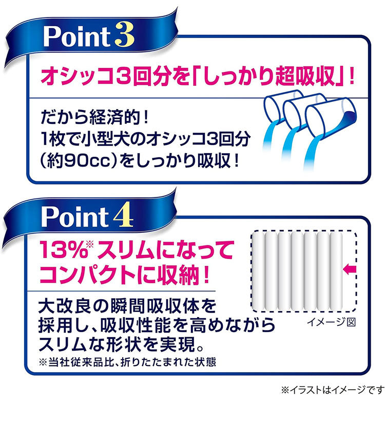 1枚で小型犬のオシッコ5回分(約150cc*)をしっかり吸収!だから経済的!(*小型犬の平均オシッコ量から算出)