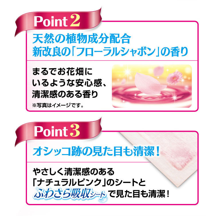 やさしく清潔感のある「ナチュラルピンク」のシートとふわさら吸収シートで見た目も清潔!