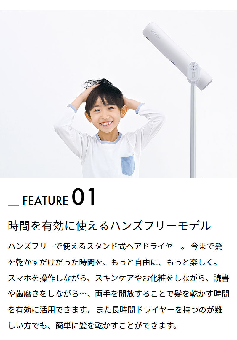 ハンズフリーで使えるスタンド式ヘアドライヤー。 今まで髪を乾かすだけだった時間を、もっと自由に、もっと楽しく。 スマホを操作しながら、スキンケアやお化粧をしながら、読書や歯磨きをしながら…、両手を開放することで髪を乾かす時間を有効に活用できます。 また長時間ドライヤーを持つのが難しい方でも、簡単に髪を乾かすことができます。
