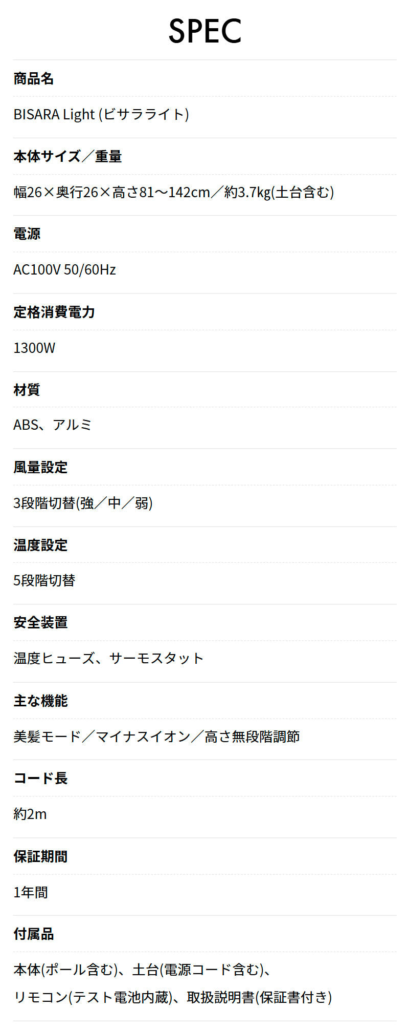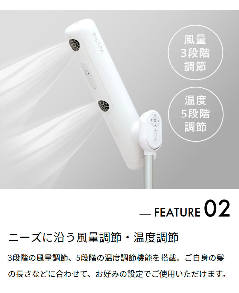 BISARA、ハンズフリースタンドヘアドライヤー、ドライヤー、ヘアドライヤー、ハンズフリー、マイナスイオン、吹き出し口2カ所、美髪、風量切替、温度切替、高さ調節、角度調節、リモコン操作、リモコン収納