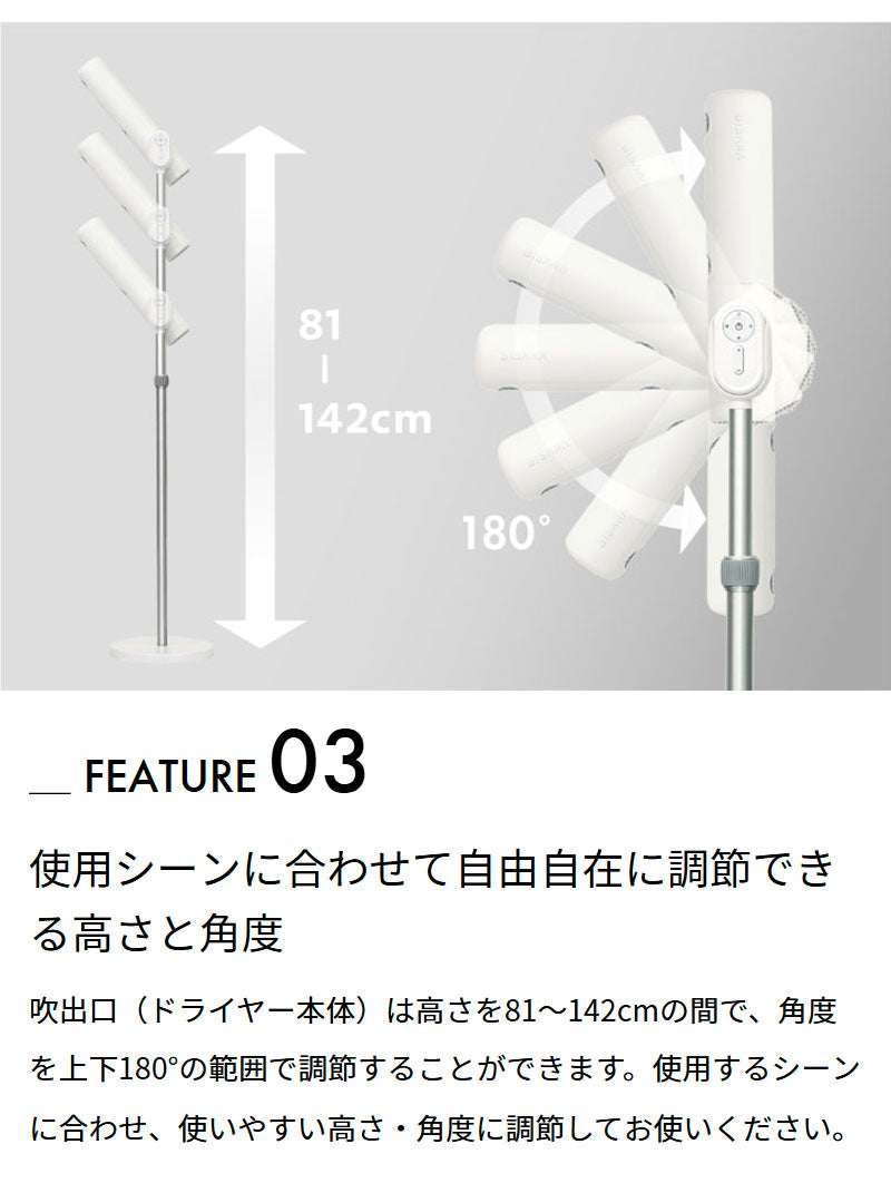 吹出口(ドライヤー本体)は高さを81~142cmの間で、角度を上下180°の範囲で調節することができます。使用するシーンに合わせ、使いやすい高さ・角度に調節してお使いください。