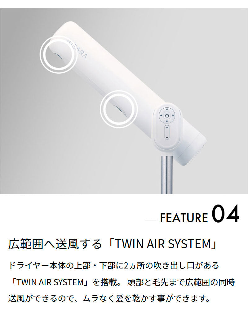 ドライヤー本体の上部・下部に2ヵ所の吹き出し口がある「TWIN AIR SYSTEM」を搭載。 頭部と毛先まで広範囲の同時送風ができるので、ムラなく髪を乾かす事ができます。
