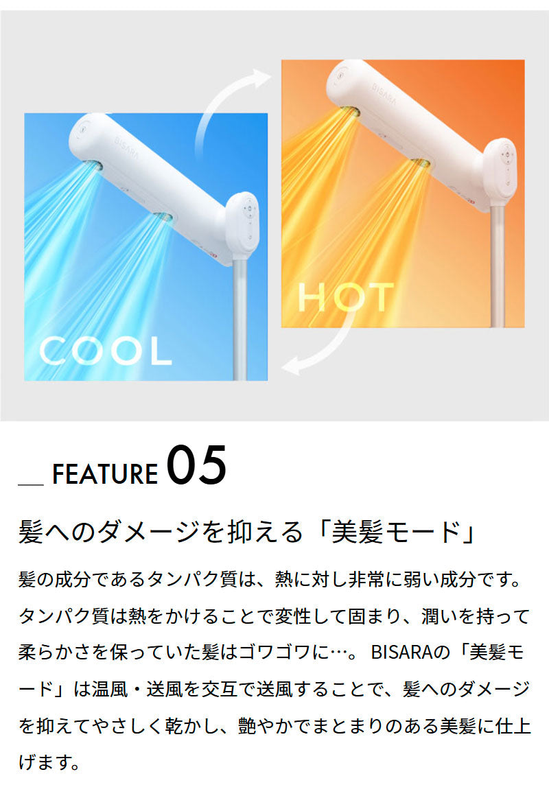 髪の成分であるタンパク質は、熱に対し非常に弱い成分です。 タンパク質は熱をかけることで変性して固まり、潤いを持って柔らかさを保っていた髪はゴワゴワに…。 BISARAの「美髪モード」は温風・送風を交互で送風することで、髪へのダメージを抑えてやさしく乾かし、艶やかでまとまりのある美髪に仕上げます。