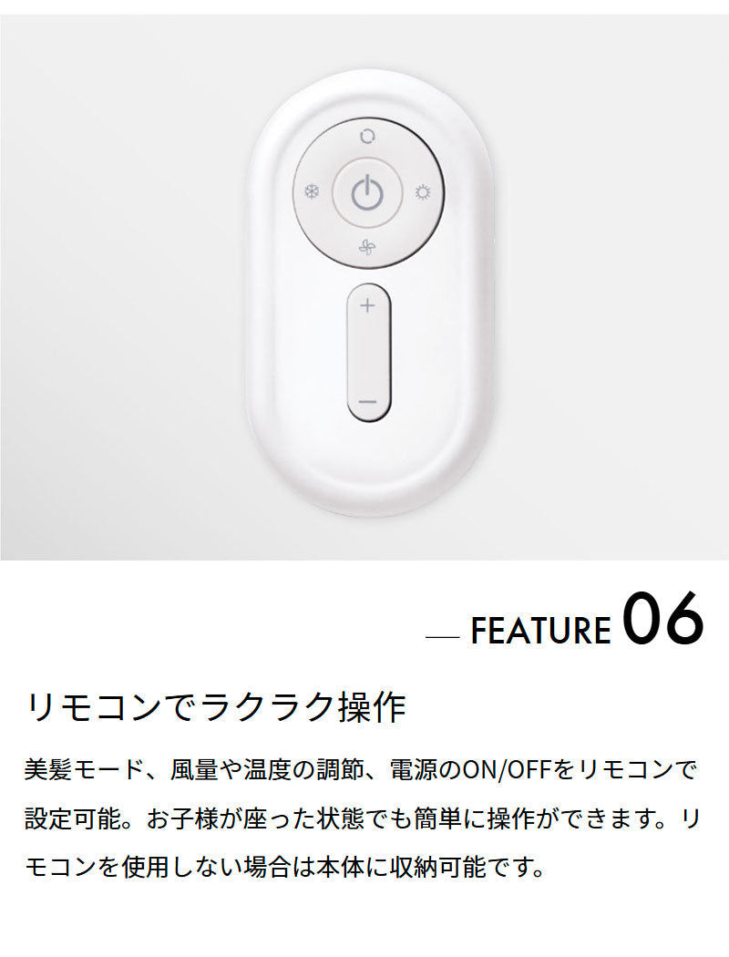 美髪モード、風量や温度の調節、電源のON/OFFをリモコンで設定可能。お子様が座った状態でも簡単に操作ができます。リモコンを使用しない場合は本体に収納可能です。