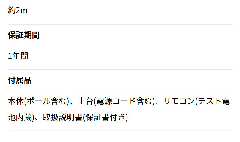 付属品:本体(ポール含む)、土台(電源コード含む)、リモコン(テスト電池内蔵)、取扱説明書(保証書付き)